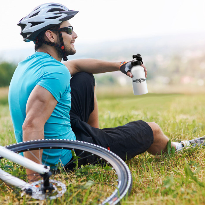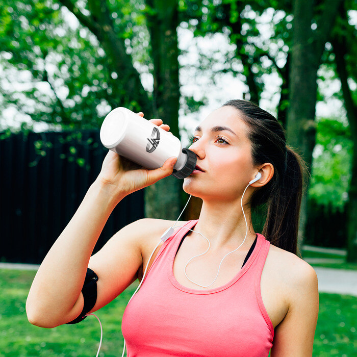 Вместительная спортивная бутылка с удобным горлышком и двумя комплектами крышек. Можно заказать со своим дизайном.