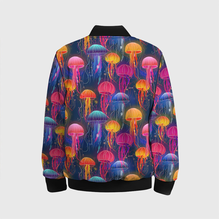 Бомбер — это короткая куртка на молнии, с эластичными вставками-резинками и манжетами. Удобный трендовый аксессуар, сшитый из комфортной синтетической ткани, на всей поверхности которой наносится принт. Можно сделать со своим дизайном.