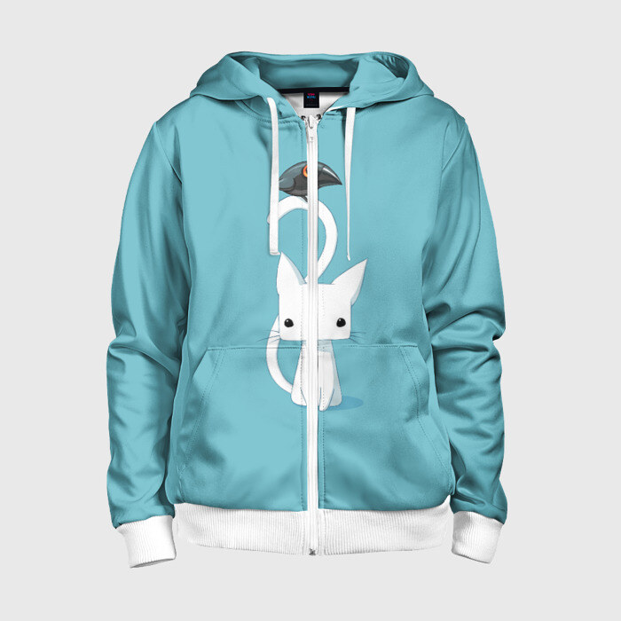 Детская толстовка 3D на молнии с принтом Белый котик и воробушек
