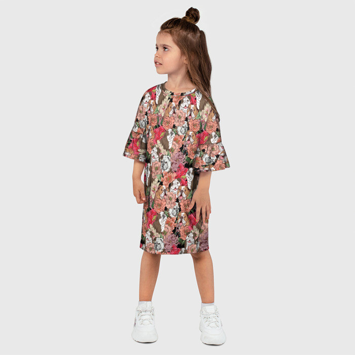 Детское платье свободного кроя из комфортной синтетической ткани. Благодаря свойствам ткани принт наносится по всей поверхности платья и позволяет цветам быть максимально яркими. Можно сделать со своим дизайном и превратить платье в праздничный костюм.