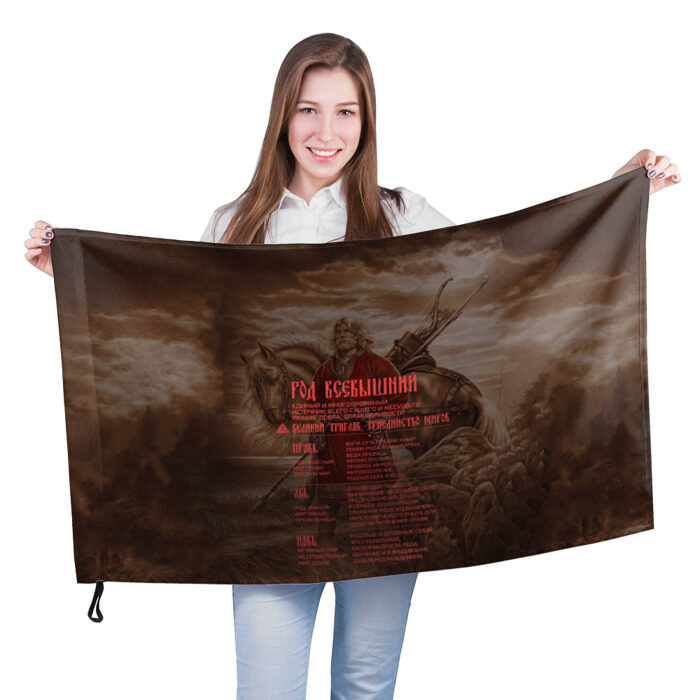 Флаг сделан из плотной синтетической ткани, с одной стороны которой наносится принт. За счет технологии нанесения изображение не выцветает под солнцем, не тускнеет от дождей и не выстирывается после сотен стирок. Можно заказать со своим дизайном.
