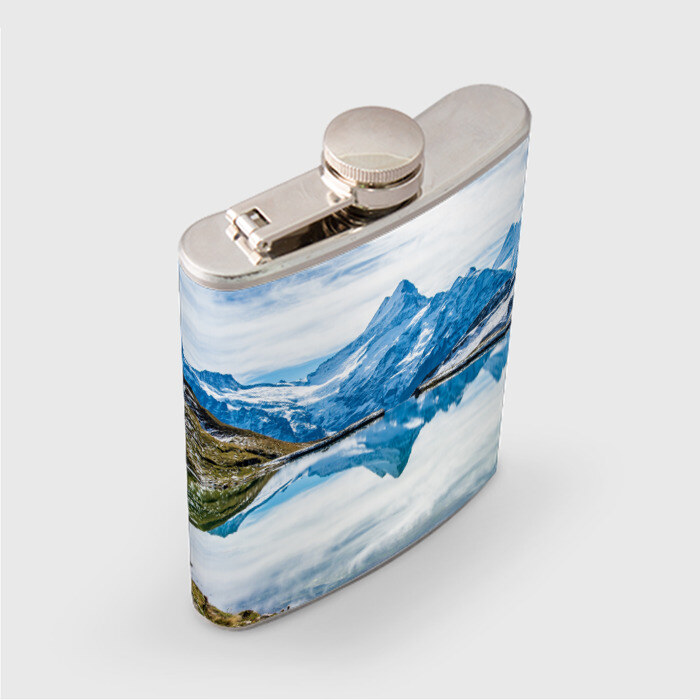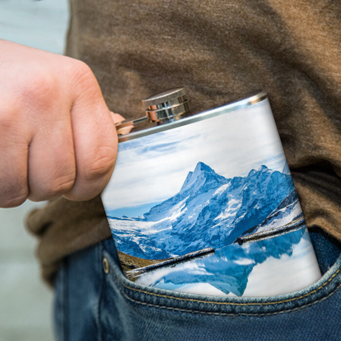 Металлическая фляжка с откручивающейся крышкой, которая имеет дополнительное крепление, так что не будет теряться. Принт наносится на специальную виниловую наклейку, которая покрывает боковые поверхности. Можно заказать со своим дизайном.