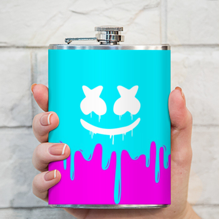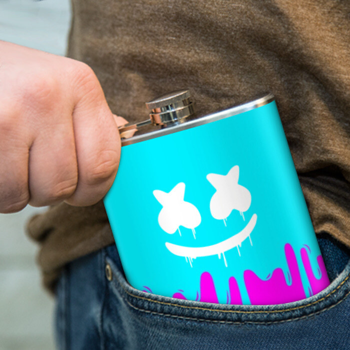 Металлическая фляжка с откручивающейся крышкой, которая имеет дополнительное крепление, так что не будет теряться. Принт наносится на специальную виниловую наклейку, которая покрывает боковые поверхности. Можно заказать со своим дизайном.
