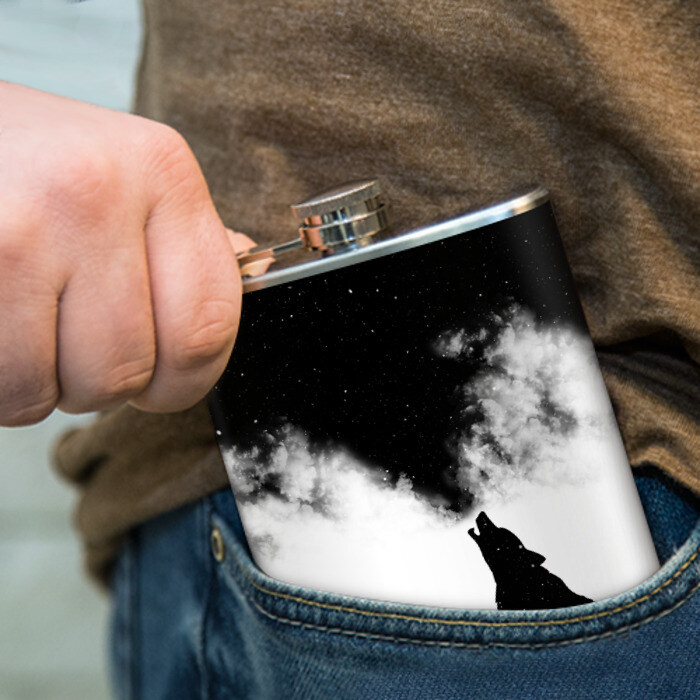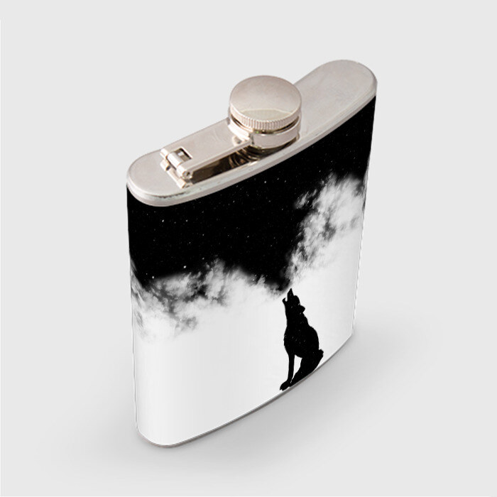 Металлическая фляжка с откручивающейся крышкой, которая имеет дополнительное крепление, так что не будет теряться. Принт наносится на специальную виниловую наклейку, которая покрывает боковые поверхности. Можно заказать со своим дизайном.