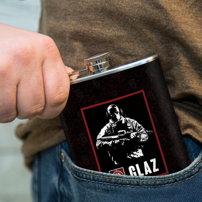 Металлическая фляжка с откручивающейся крышкой, которая имеет дополнительное крепление, так что не будет теряться. Принт наносится на специальную виниловую наклейку, которая покрывает боковые поверхности. Можно заказать со своим дизайном.
