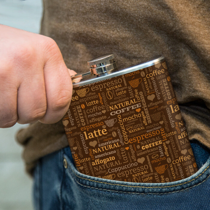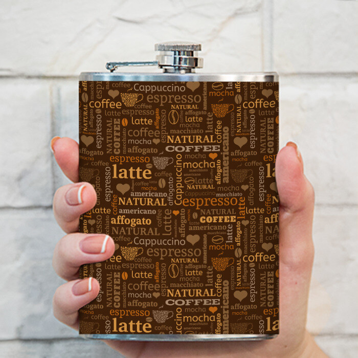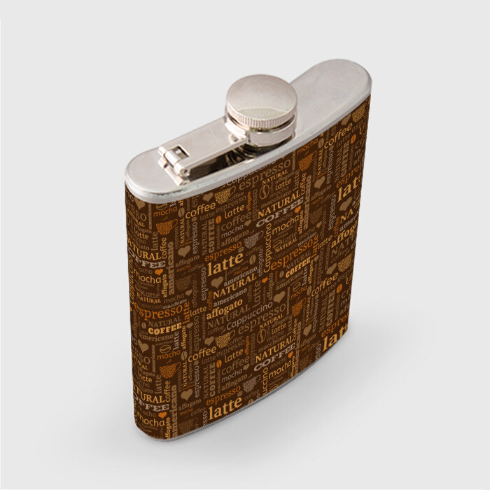 Металлическая фляжка с откручивающейся крышкой, которая имеет дополнительное крепление, так что не будет теряться. Принт наносится на специальную виниловую наклейку, которая покрывает боковые поверхности. Можно заказать со своим дизайном.