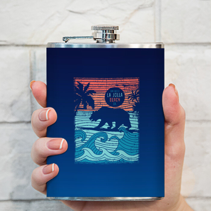 Металлическая фляжка с откручивающейся крышкой, которая имеет дополнительное крепление, так что не будет теряться. Принт наносится на специальную виниловую наклейку, которая покрывает боковые поверхности. Можно заказать со своим дизайном.