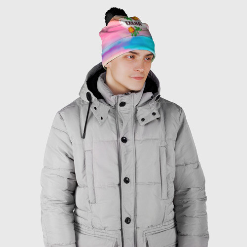 Шапка сшита из гладкой синтетической ткани, сверху крепится пушистый помпон. Двухслойная, между слоями спрятан тонкий теплый начес, за счет которого шапка согреет прохладной осенью и весной. Внутренний слой такой же гладкий и мягкий, как и внешний. Можно заказать шапку со своим рисунком.
