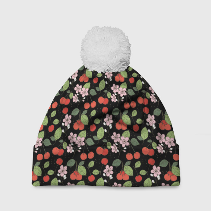 Шапка 3D c помпоном с принтом Паттерн цветы и вишня