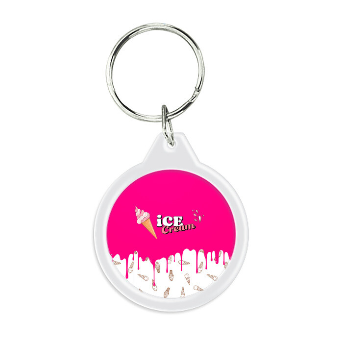 Круглый брелок из пластика с металлическим кольцом-креплением. Изображение наносится с одной стороны. Можно заказать со своим дизайном.