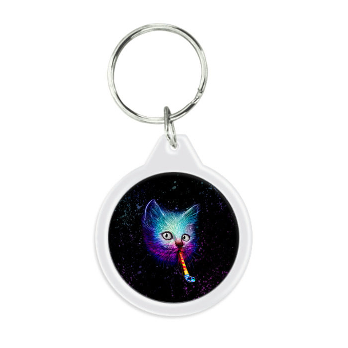 Круглый брелок из пластика с металлическим кольцом-креплением. Изображение наносится с одной стороны. Можно заказать со своим дизайном.