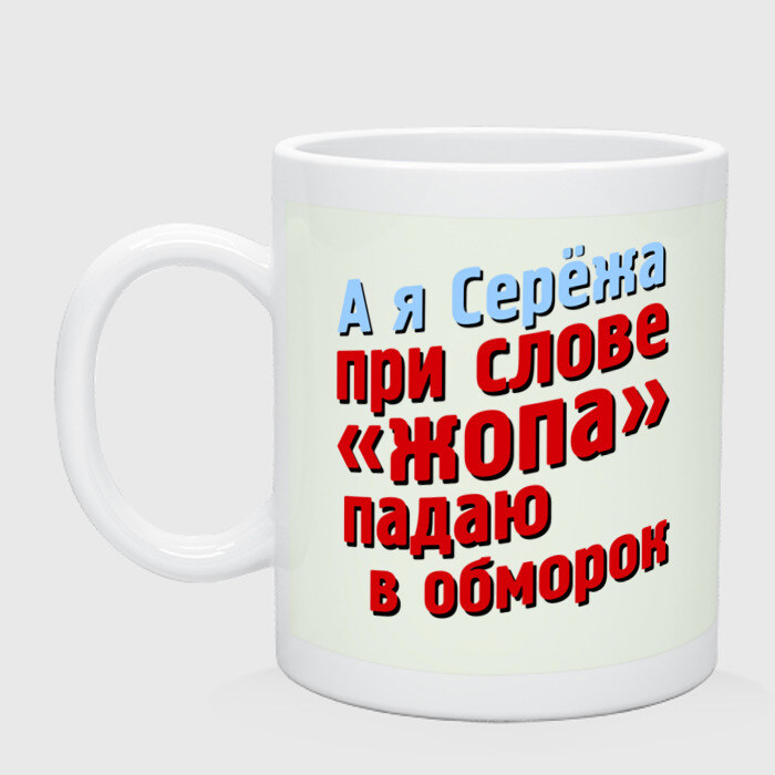 Кружка с принтом Серёжа при слове жопа падает в обморок