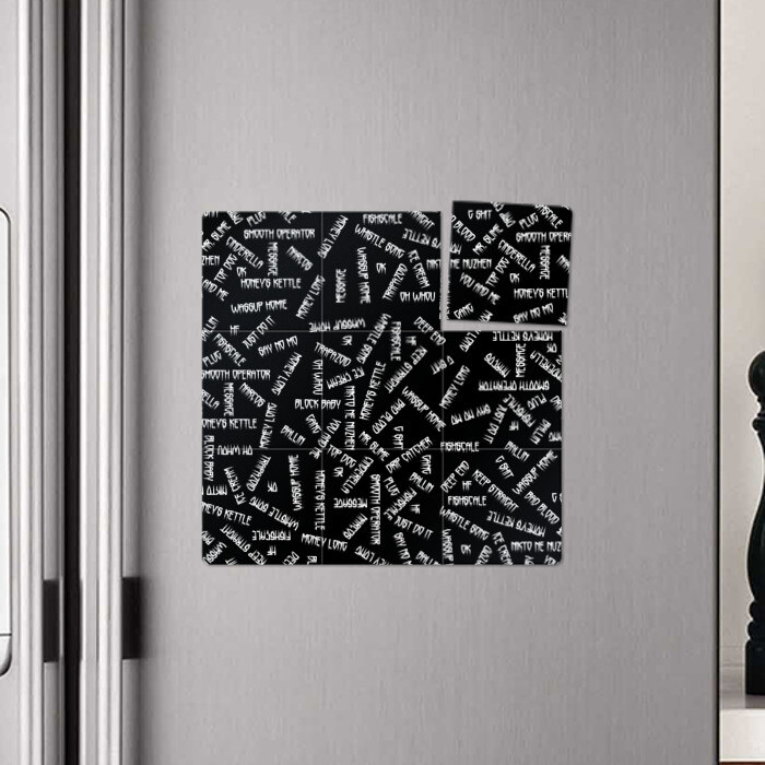 Магнитные плакаты отлично держатся на металлических поверхностях, например холодильниках, и станут необычным украшением интерьера. Плакат собирается из девяти составных частей, угловые магниты имеют аккуратные закруглённые углы. Изображение наносится методом сублимации.