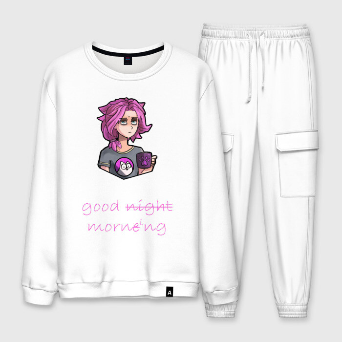 Костюм из мягкого хлопка с мягким и теплым начесом внутри. Базовая вещь в гардеробе, которую можно сочетать с другими вещами: например, брюки надеть с другой футболкой, верх носить отдельно. Пара выполнена из хлопка одного цвета, а брюки сшиты из той же ткани, что и базовый хлопковый свитшот . Брюки на поясе фиксируются не только широкой трикотажной резинкой, но и дополнительными завязками. Принт наносится только на свитшот. Можно заказать как со своим дизайном, так и вообще без него.