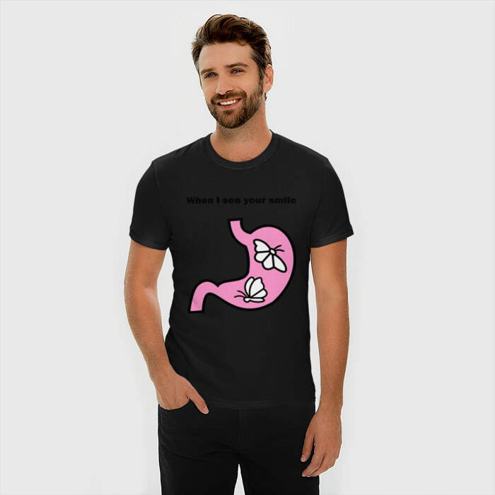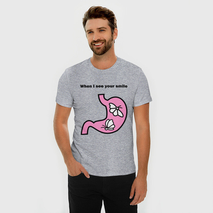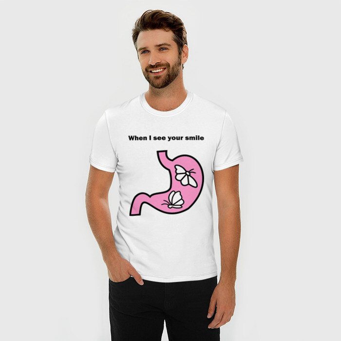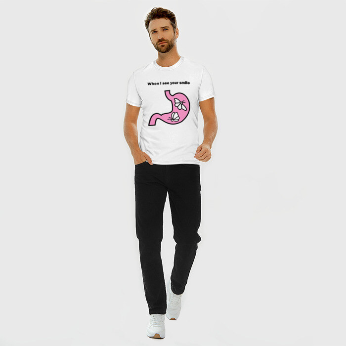 Футболка из плотного хлопка с добавлением лайкры: за счет этого ткань немного тянется, хорошо держит форму и комфортно садится по фигуре. Силуэт приталенный, ориентирован на мужчин с широкими плечами и узкими бедрами. Понравится тем, кто хочет подчеркнуть достоинства своего торса и любит футболки “по фигуре”.