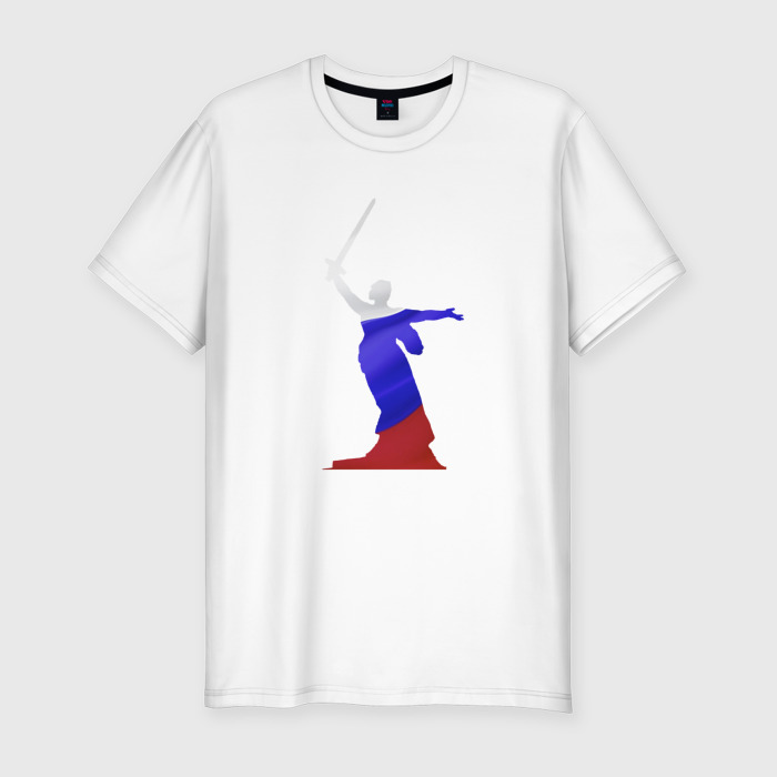 Мужская футболка хлопок Slim с принтом Родина Мать на фоне флага России