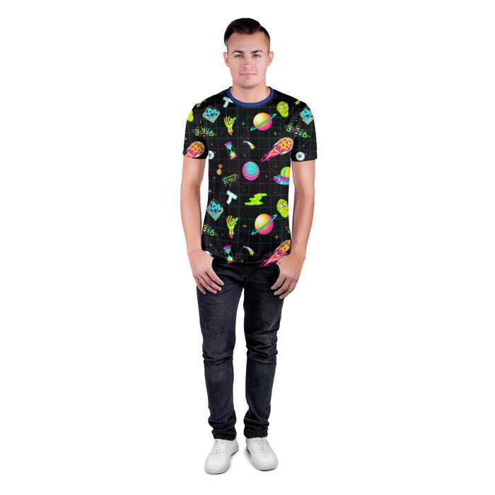 Футболка из синтетической премиум-ткани с улучшенными характеристиками: лучше пропускает воздух, влагу и быстро высыхает от тепла тела. Тянется, но сохраняет форму. За счет этих свойств особенно хороша для занятий спортом, но подойдет и для повседневной носки. Силуэт приталенный, ориентирован на мужчин с широкими плечами и узкими бедрами: понравится тем, кто хочет подчеркнуть достоинства своего торса и любит футболки “по фигуре”.  На ощупь футболки очень мягкие и приятные. Принт наносится по всей поверхности, можно заказать со своим дизайном.