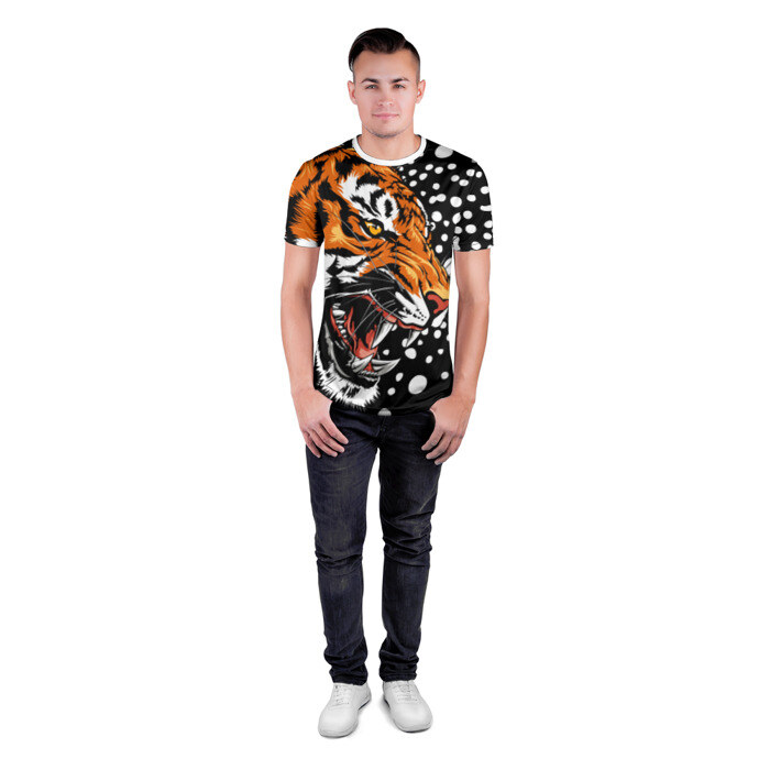 Футболка из синтетической премиум-ткани с улучшенными характеристиками: лучше пропускает воздух, влагу и быстро высыхает от тепла тела. Тянется, но сохраняет форму. За счет этих свойств особенно хороша для занятий спортом, но подойдет и для повседневной носки. Силуэт приталенный, ориентирован на мужчин с широкими плечами и узкими бедрами: понравится тем, кто хочет подчеркнуть достоинства своего торса и любит футболки “по фигуре”.  На ощупь футболки очень мягкие и приятные. Принт наносится по всей поверхности, можно заказать со своим дизайном.