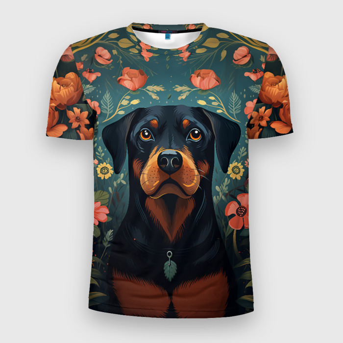 Мужская футболка 3D Slim с принтом Ротвейлер в стиле фолк арт