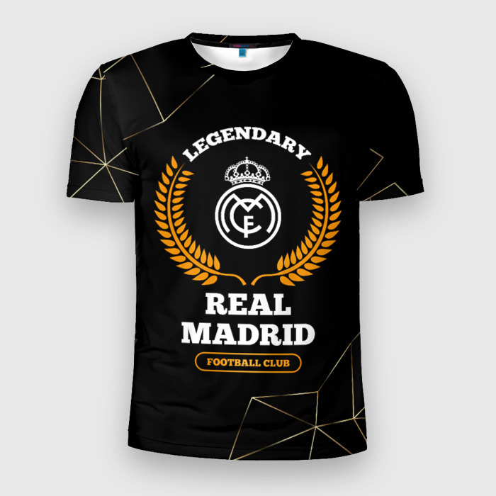 Мужская футболка 3D Slim с принтом Лого Real Madrid и надпись legendary football club на темном фоне