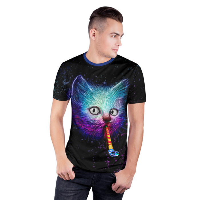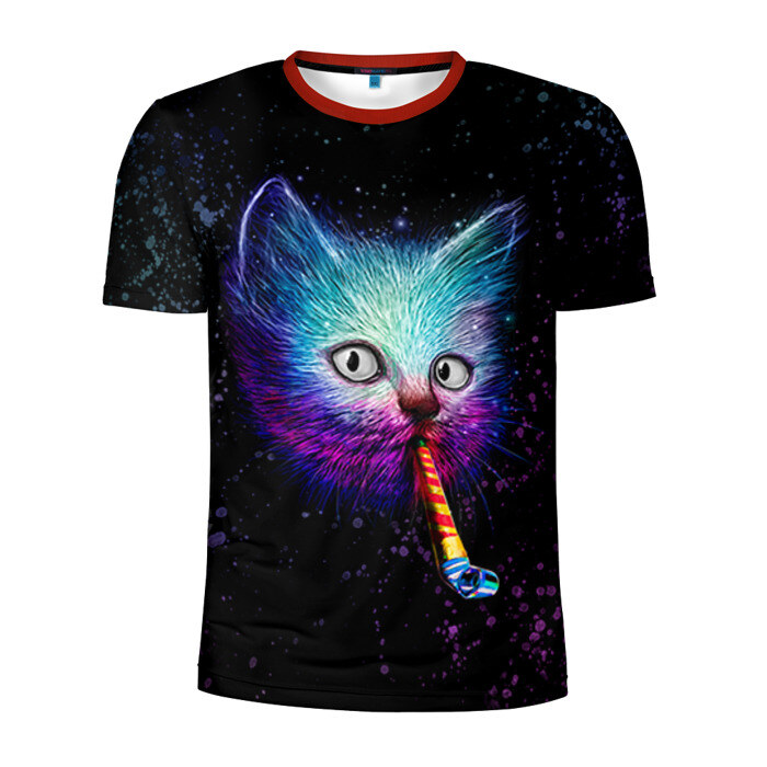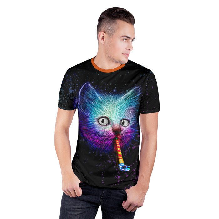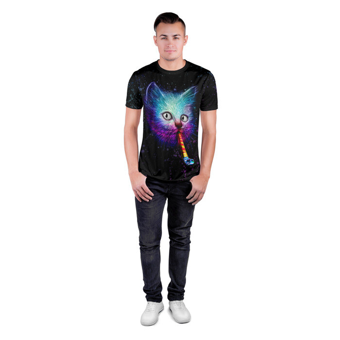 Футболка из синтетической премиум-ткани с улучшенными характеристиками: лучше пропускает воздух, влагу и быстро высыхает от тепла тела. Тянется, но сохраняет форму. За счет этих свойств особенно хороша для занятий спортом, но подойдет и для повседневной носки. Силуэт приталенный, ориентирован на мужчин с широкими плечами и узкими бедрами: понравится тем, кто хочет подчеркнуть достоинства своего торса и любит футболки “по фигуре”.  На ощупь футболки очень мягкие и приятные. Принт наносится по всей поверхности, можно заказать со своим дизайном.
