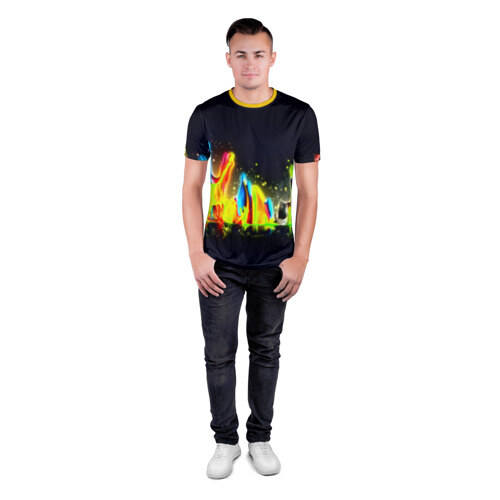 Футболка из синтетической премиум-ткани с улучшенными характеристиками: лучше пропускает воздух, влагу и быстро высыхает от тепла тела. Тянется, но сохраняет форму. За счет этих свойств особенно хороша для занятий спортом, но подойдет и для повседневной носки. Силуэт приталенный, ориентирован на мужчин с широкими плечами и узкими бедрами: понравится тем, кто хочет подчеркнуть достоинства своего торса и любит футболки “по фигуре”.  На ощупь футболки очень мягкие и приятные. Принт наносится по всей поверхности, можно заказать со своим дизайном.