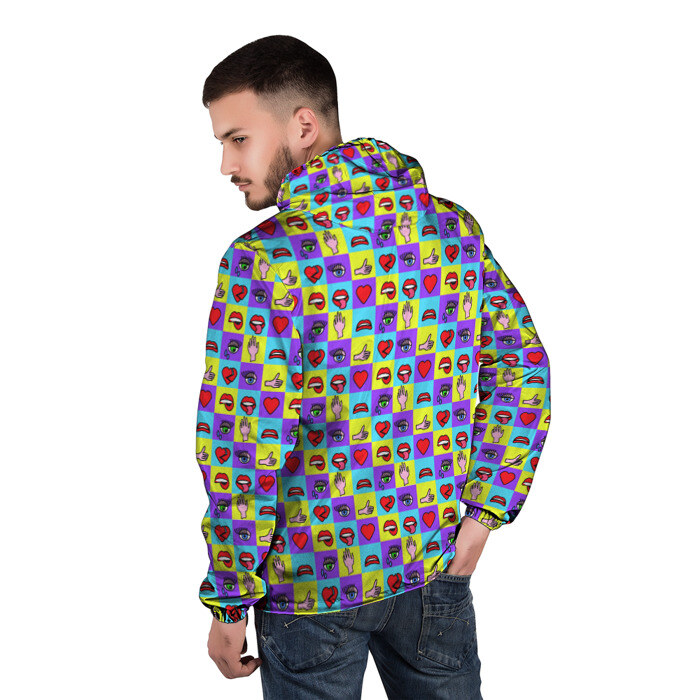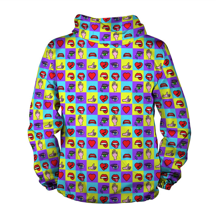 Свободная легкая ветровка с капюшоном, застегивается на молнию. Сшита из плотной ткани, по всей поверхности которой наносится принт. Можно заказать со своим дизайном.