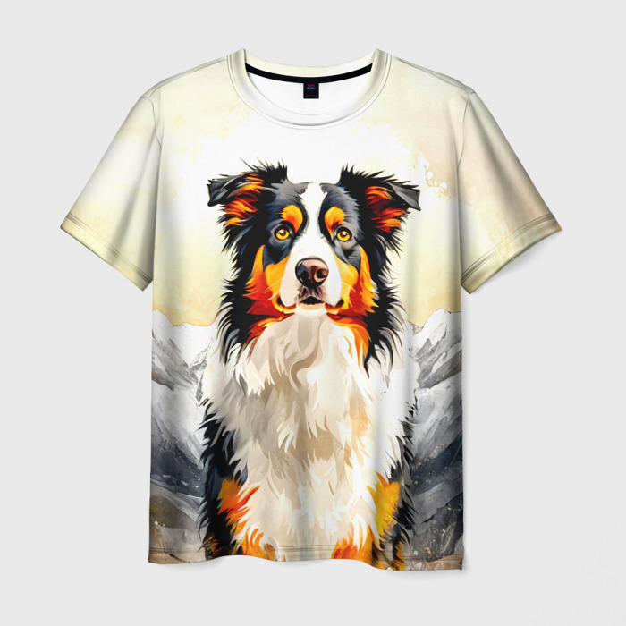 Мужская футболка 3D Австралийская овчарка и белые горы