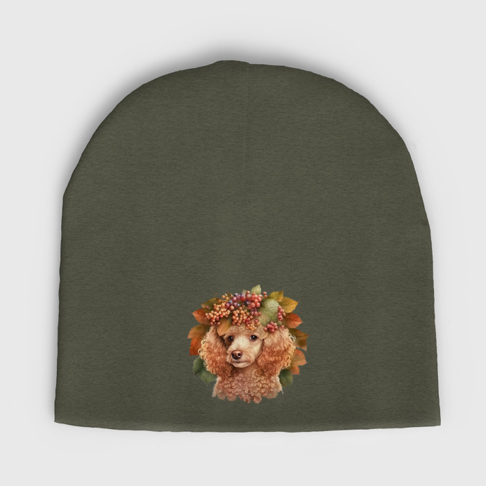 Мужская шапка демисезонная Пудель абрикосовый с венком из осенних листьев