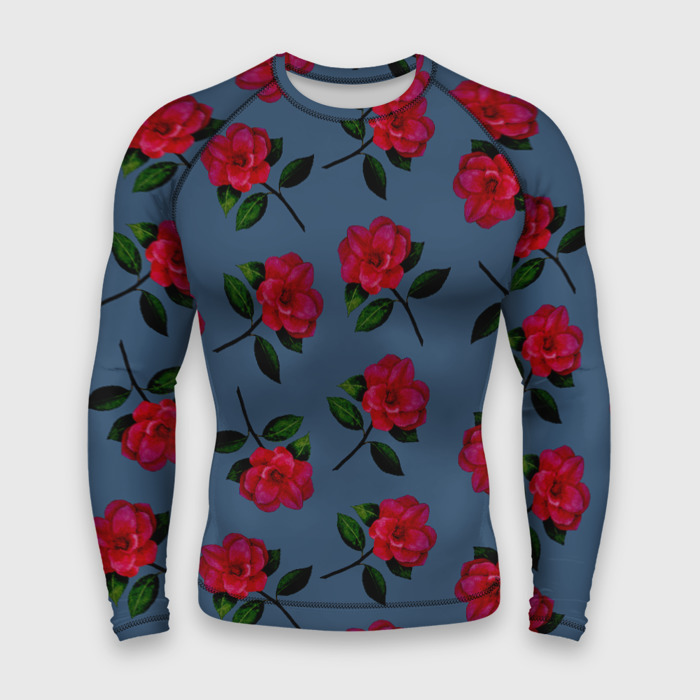 Мужской рашгард 3D Красные камелии на темно сером фоне