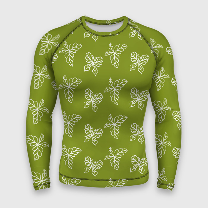 Мужской рашгард 3D Узор. Белые листья на оливковом.