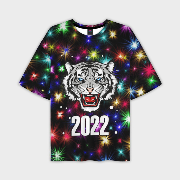 Мужские футболки OVERSIZE БЕЛЫЙ ТИГР 2022 И НОВОГОДНИЕ ОГНИ