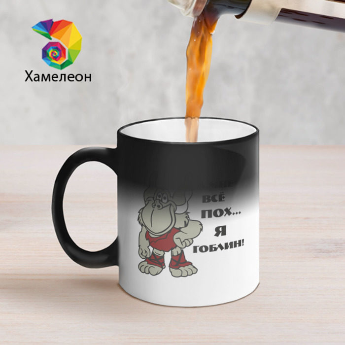 Кружка-сюрприз: пока в ней холодная вода, она будет оставаться однотонной, а когда нальете горячую — проявится принт. Принт начинает проявляться буквально через 10 секунд, в течение минуты он будет виден полностью. Когда остынет, кружка вернется к изначальному цвету.