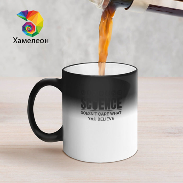 Кружка-сюрприз: пока в ней холодная вода, она будет оставаться однотонной, а когда нальете горячую — проявится принт. Принт начинает проявляться буквально через 10 секунд, в течение минуты он будет виден полностью. Когда остынет, кружка вернется к изначальному цвету.