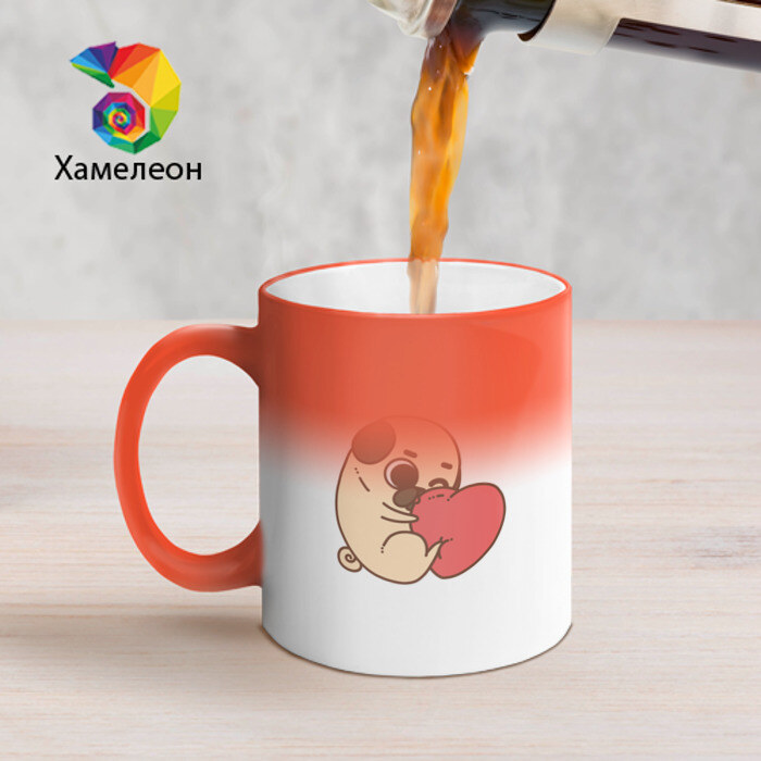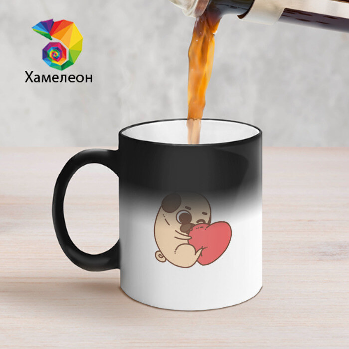 Кружка-сюрприз: пока в ней холодная вода, она будет оставаться однотонной, а когда нальете горячую — проявится принт. Принт начинает проявляться буквально через 10 секунд, в течение минуты он будет виден полностью. Когда остынет, кружка вернется к изначальному цвету.