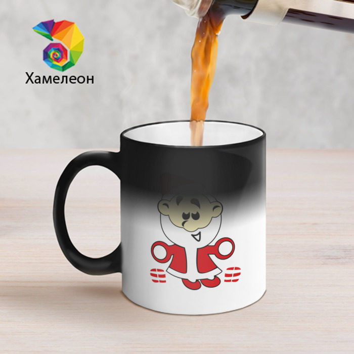 Кружка-сюрприз: пока в ней холодная вода, она будет оставаться однотонной, а когда нальете горячую — проявится принт. Принт начинает проявляться буквально через 10 секунд, в течение минуты он будет виден полностью. Когда остынет, кружка вернется к изначальному цвету.
