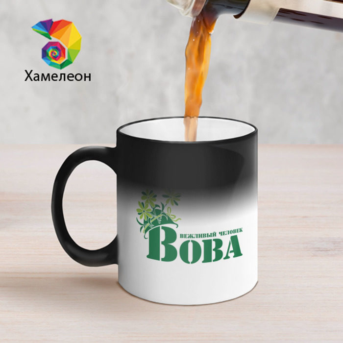 Кружка-сюрприз: пока в ней холодная вода, она будет оставаться однотонной, а когда нальете горячую — проявится принт. Принт начинает проявляться буквально через 10 секунд, в течение минуты он будет виден полностью. Когда остынет, кружка вернется к изначальному цвету.