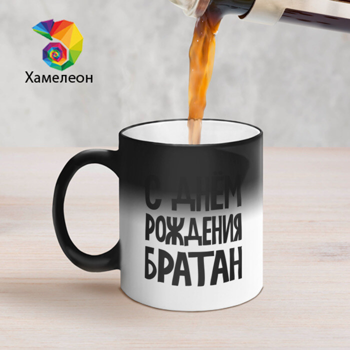 Кружка-сюрприз: пока в ней холодная вода, она будет оставаться однотонной, а когда нальете горячую — проявится принт. Принт начинает проявляться буквально через 10 секунд, в течение минуты он будет виден полностью. Когда остынет, кружка вернется к изначальному цвету.