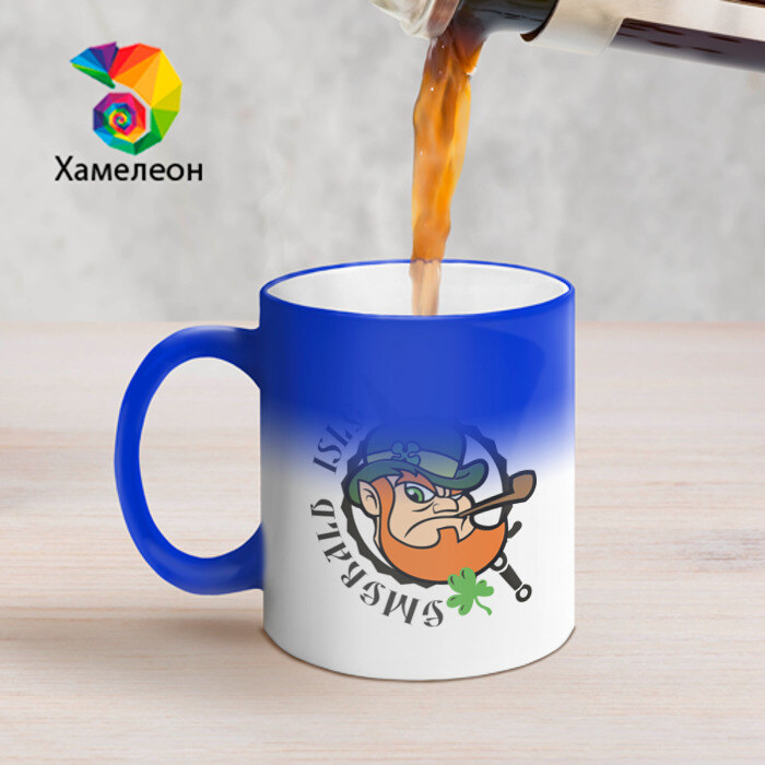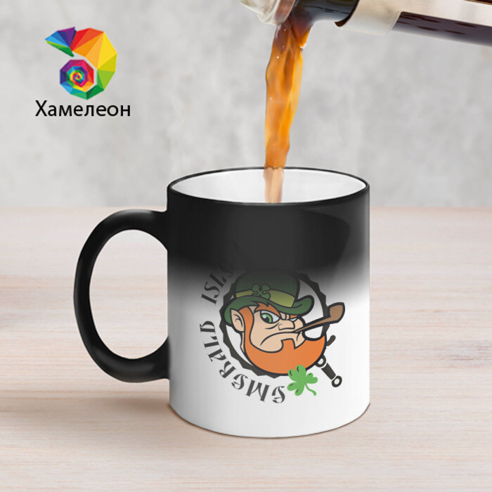 Кружка-сюрприз: пока в ней холодная вода, она будет оставаться однотонной, а когда нальете горячую — проявится принт. Принт начинает проявляться буквально через 10 секунд, в течение минуты он будет виден полностью. Когда остынет, кружка вернется к изначальному цвету.