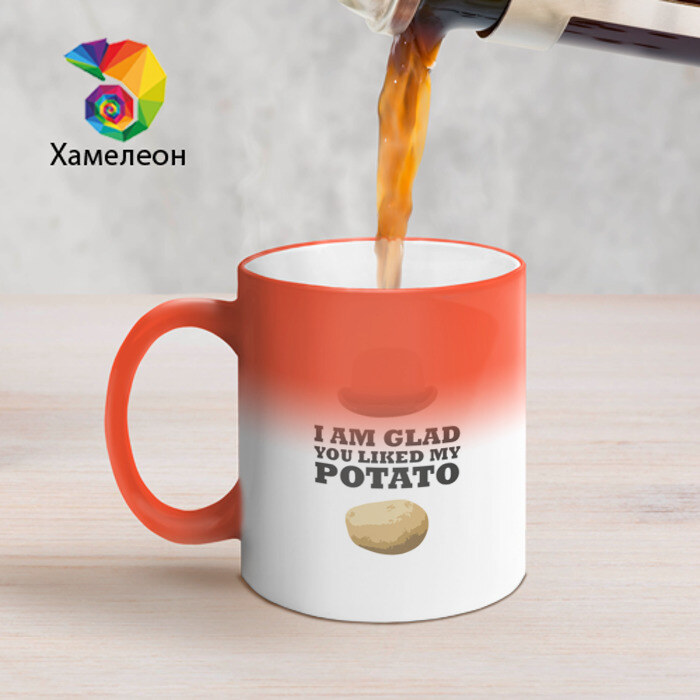 Кружка-сюрприз: пока в ней холодная вода, она будет оставаться однотонной, а когда нальете горячую — проявится принт. Принт начинает проявляться буквально через 10 секунд, в течение минуты он будет виден полностью. Когда остынет, кружка вернется к изначальному цвету.