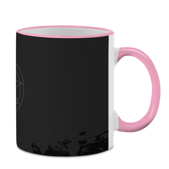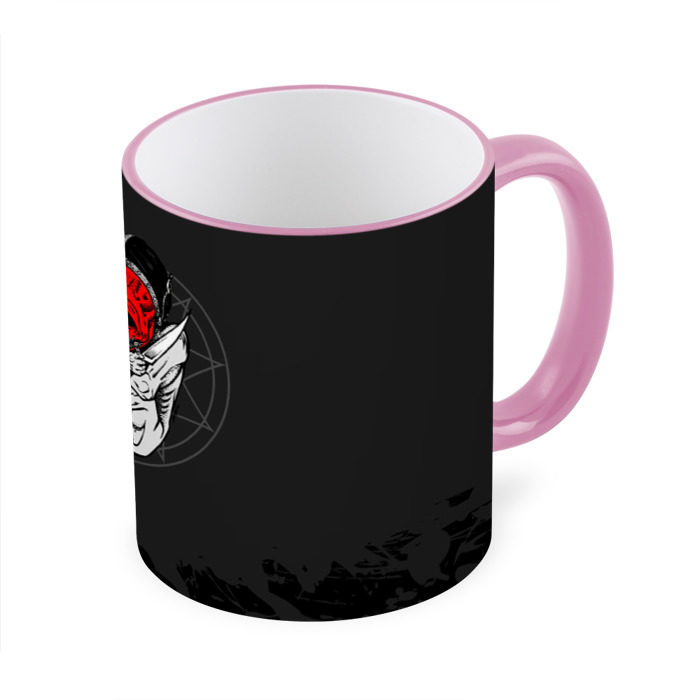 Кружка с принтом, который наносится по всей внешней поверхности, кроме прямоугольника у ручки. У кружки цветной ободок сверху и ручка. Можно заказать со своим дизайном.