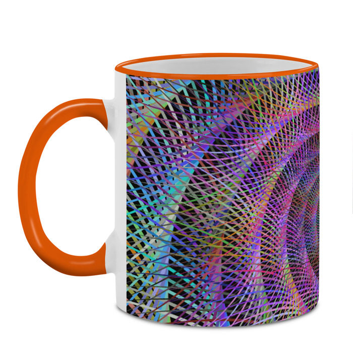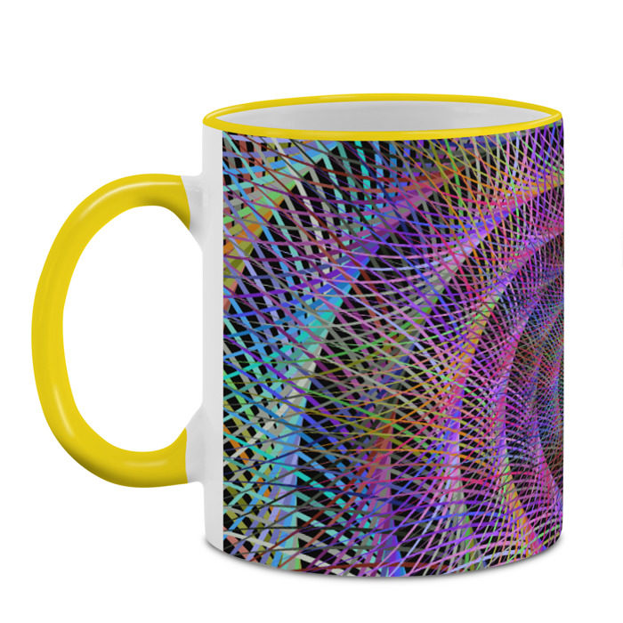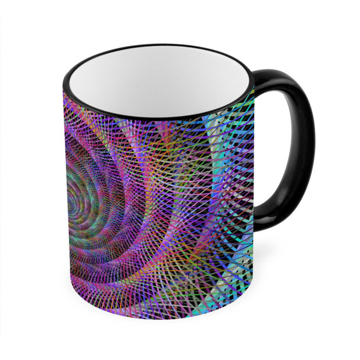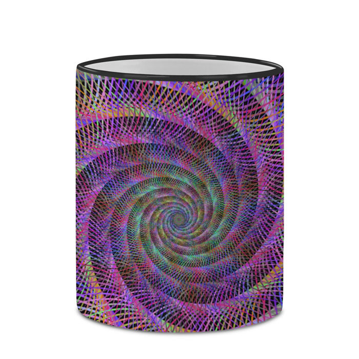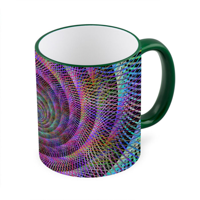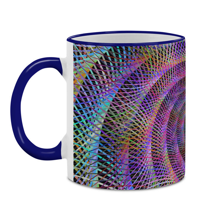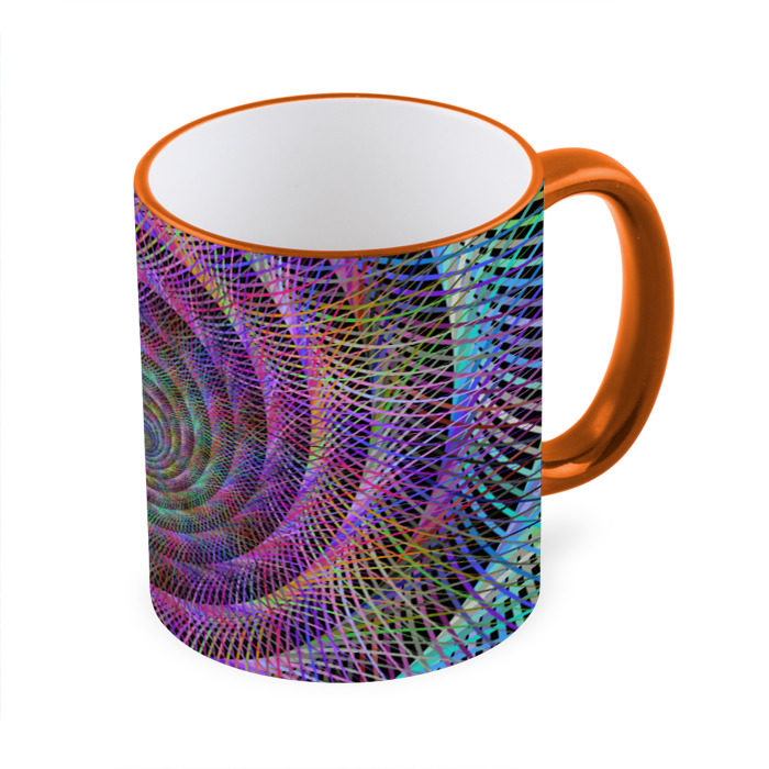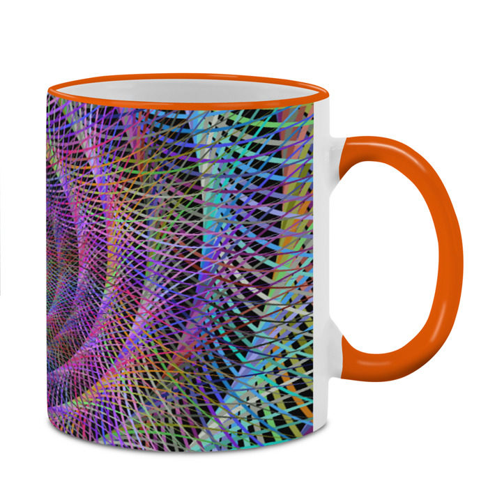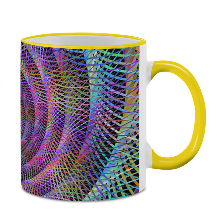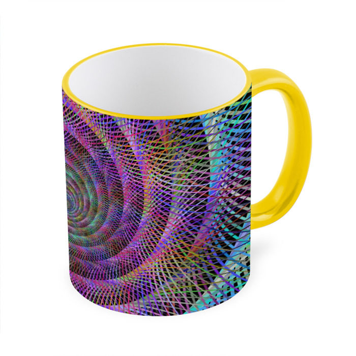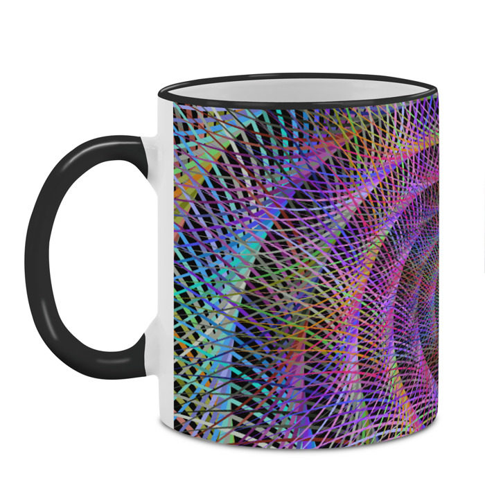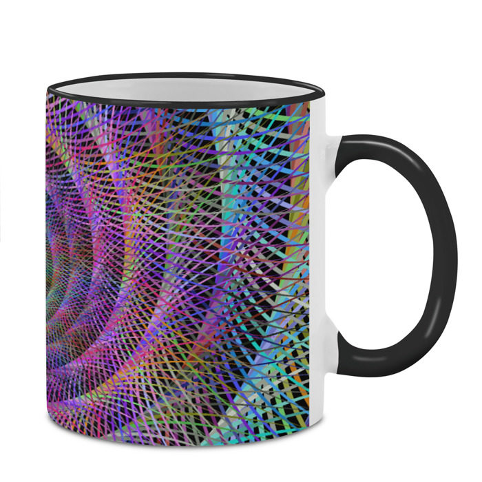 Кружка с принтом, который наносится по всей внешней поверхности, кроме прямоугольника у ручки. У кружки цветной ободок сверху и ручка. Можно заказать со своим дизайном.