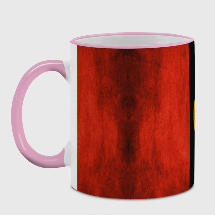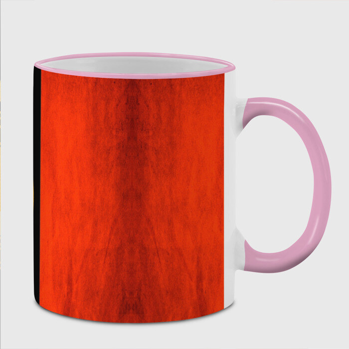 Кружка с принтом, который наносится по всей внешней поверхности, кроме прямоугольника у ручки. У кружки цветной ободок сверху и ручка. Можно заказать со своим дизайном.