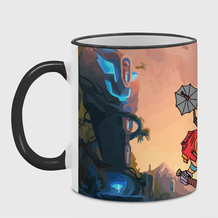 Кружка с принтом, который наносится по всей внешней поверхности, кроме прямоугольника у ручки. У кружки цветной ободок сверху и ручка. Можно заказать со своим дизайном.