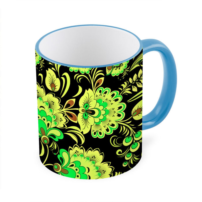 Кружка с принтом, который наносится по всей внешней поверхности, кроме прямоугольника у ручки. У кружки цветной ободок сверху и ручка. Можно заказать со своим дизайном.