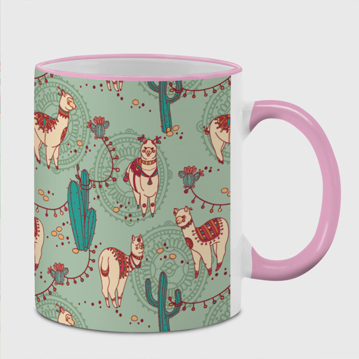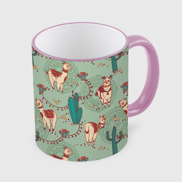 Кружка с принтом, который наносится по всей внешней поверхности, кроме прямоугольника у ручки. У кружки цветной ободок сверху и ручка. Можно заказать со своим дизайном.