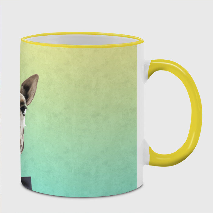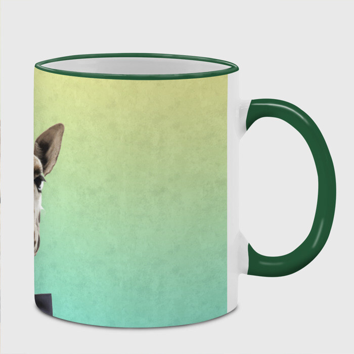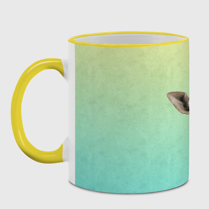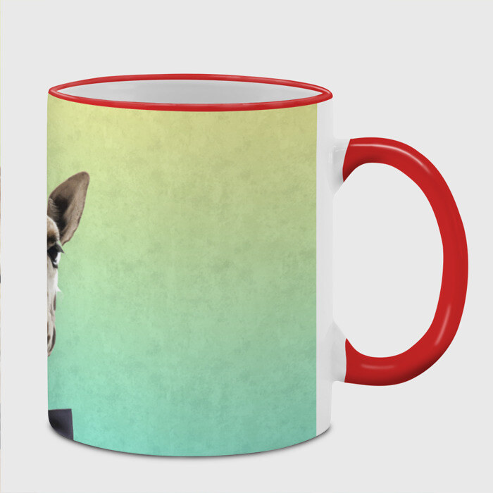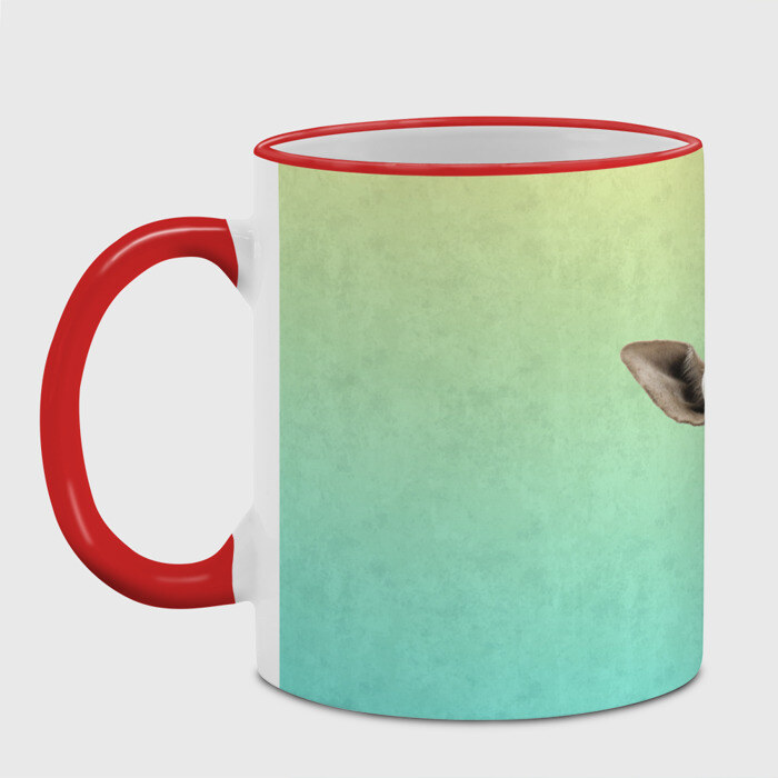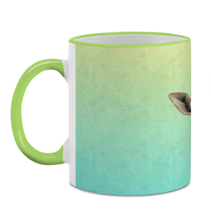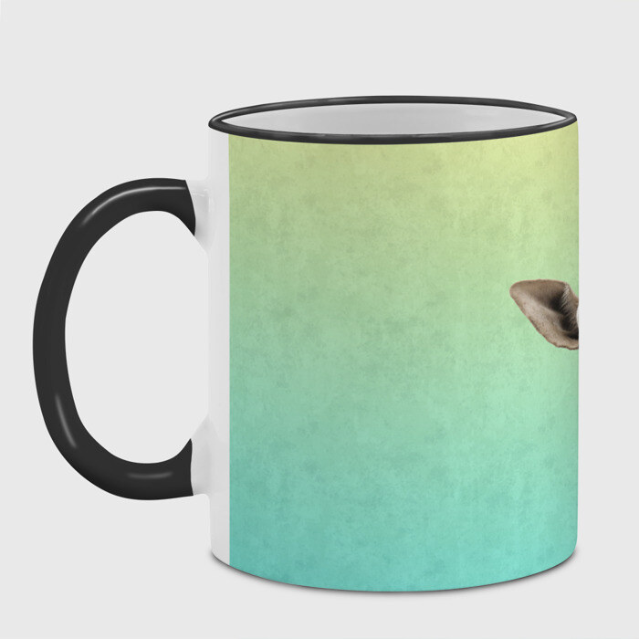 Кружка с принтом, который наносится по всей внешней поверхности, кроме прямоугольника у ручки. У кружки цветной ободок сверху и ручка. Можно заказать со своим дизайном.