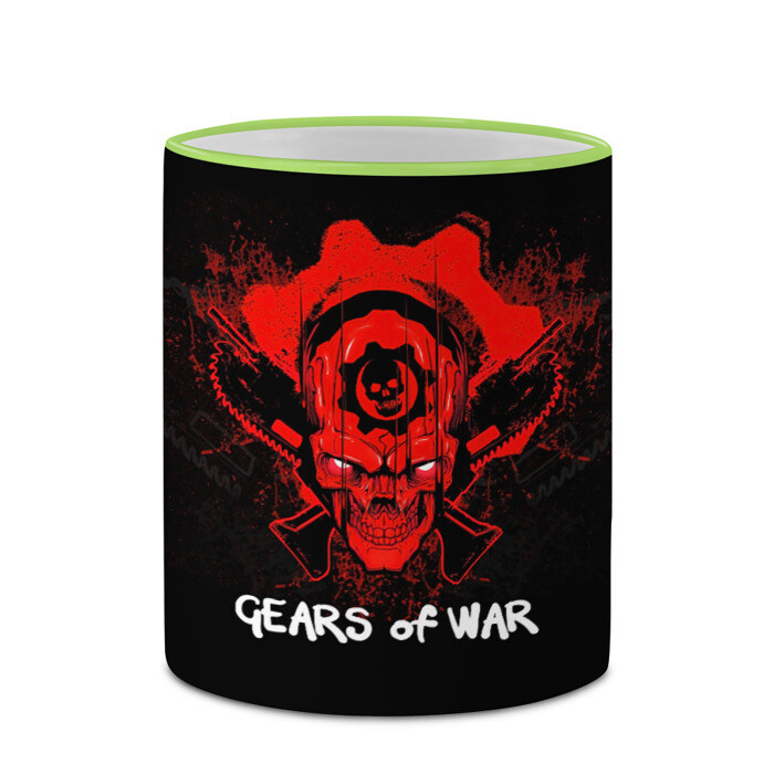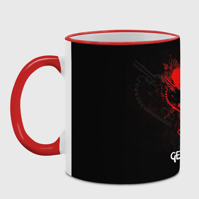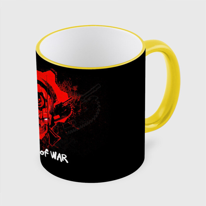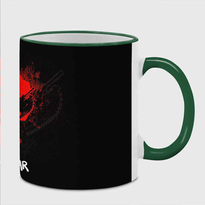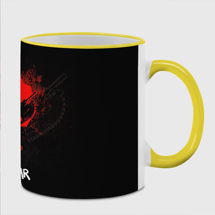 Кружка с принтом, который наносится по всей внешней поверхности, кроме прямоугольника у ручки. У кружки цветной ободок сверху и ручка. Можно заказать со своим дизайном.