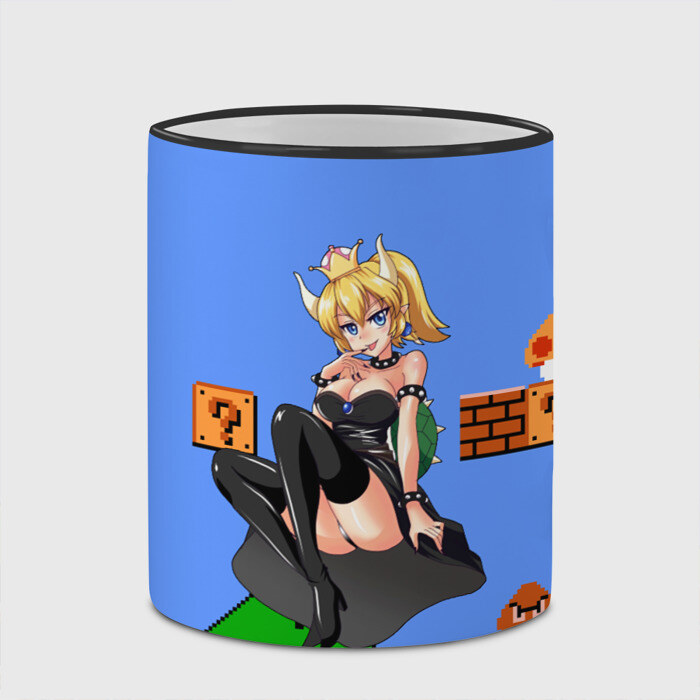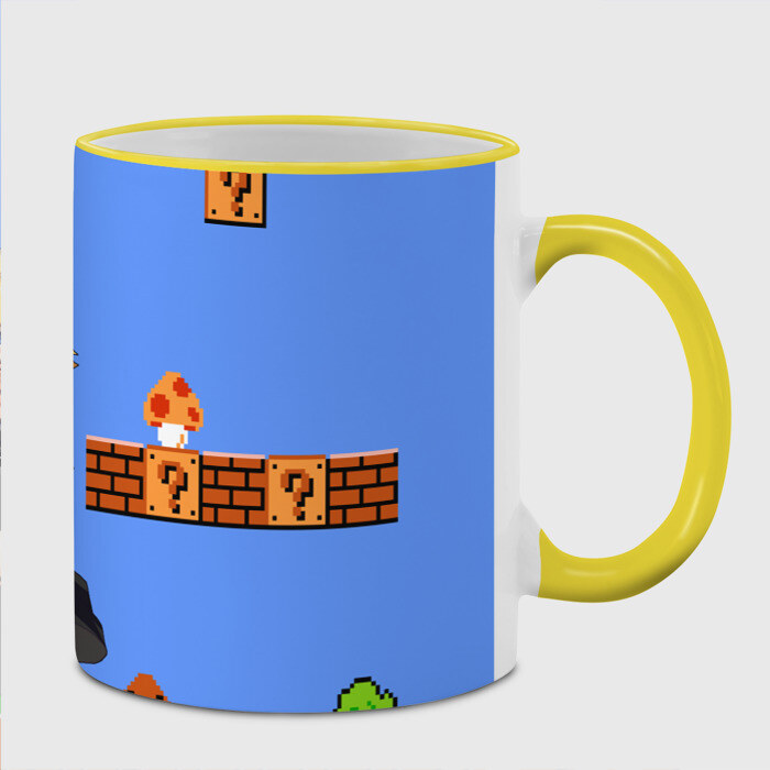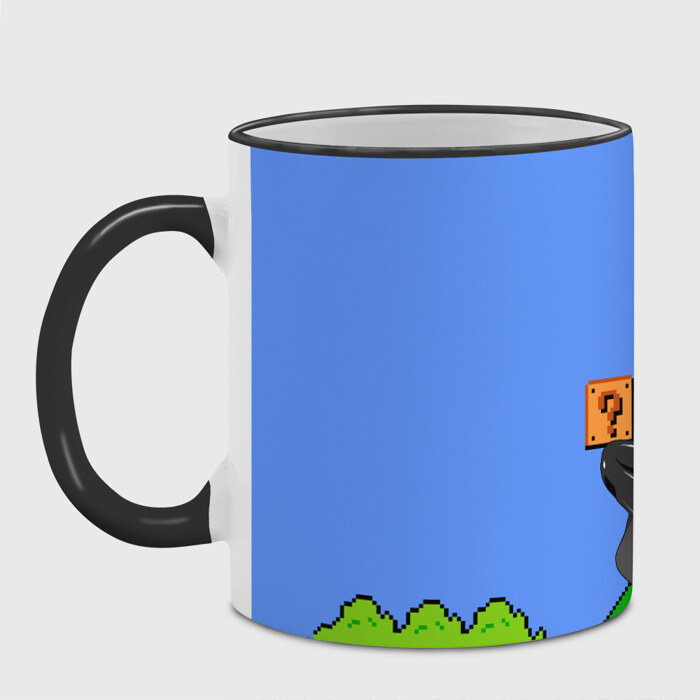 Кружка с принтом, который наносится по всей внешней поверхности, кроме прямоугольника у ручки. У кружки цветной ободок сверху и ручка. Можно заказать со своим дизайном.