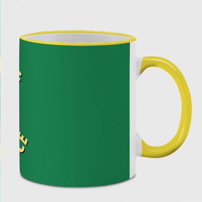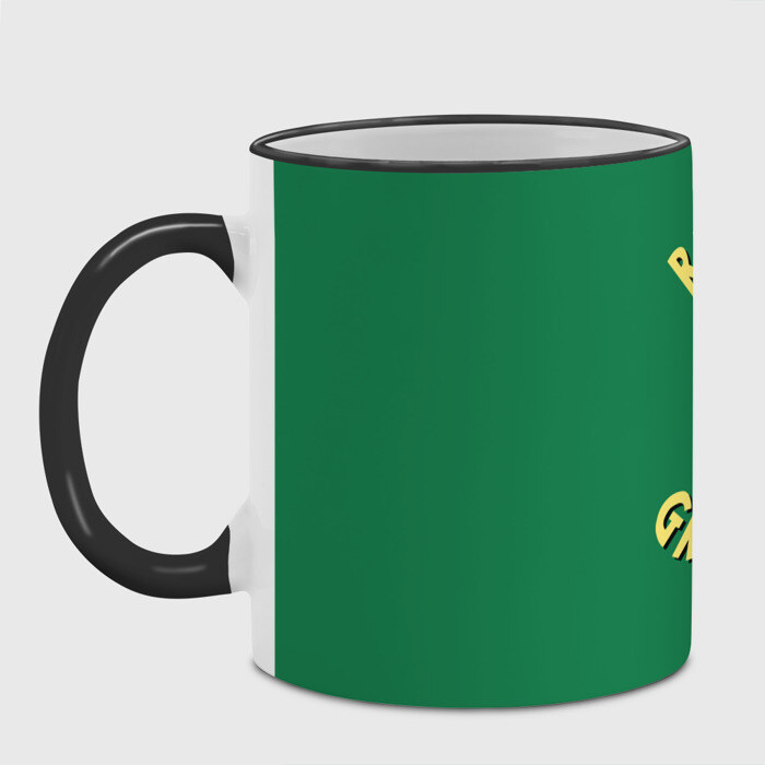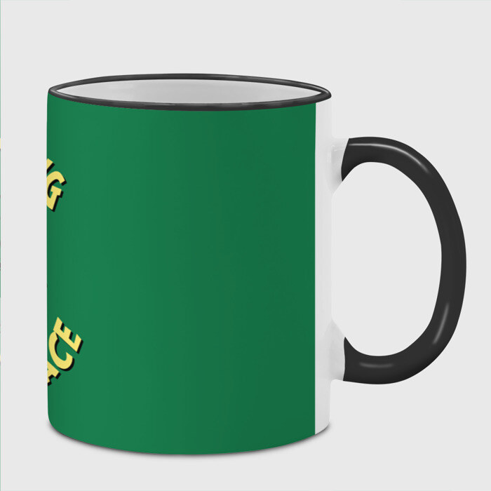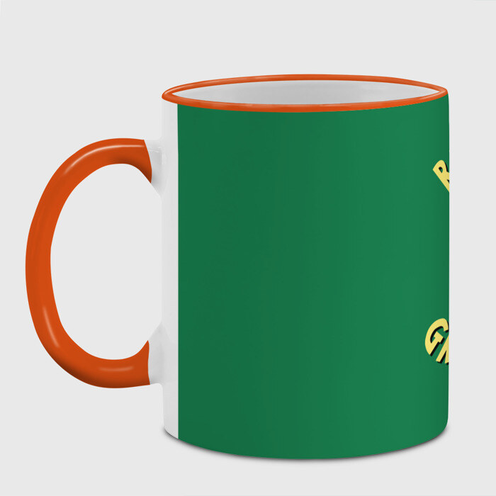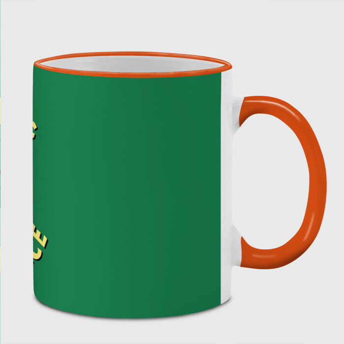Кружка с принтом, который наносится по всей внешней поверхности, кроме прямоугольника у ручки. У кружки цветной ободок сверху и ручка. Можно заказать со своим дизайном.